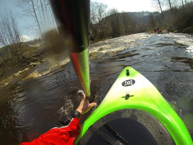 Štěpánská sekce: vyražíme s Kenym a ségrou jako fotografkou a řidičkou směr Mýto, v plánu je rozpádlování na Mumlavě a Jizeře a pak pokus o Kamiennou. Na Mýtě už čekají další dvě auta s tím, že na Kamiennou se vyráží hned, protože už má dost nakoupeno a bude se to jen zhoršovat. Kluci začínají od motokrossu, já s Kenym až od parkoviště taxíků na konci Szkl. Poreby. Na vodu nasedáme cca ve 13.15, kluci to sypou dolů, v jenom válci mezi skalní plotnou a silniční navigacíse zabydluje Ivoš a krysí. Místo raději obnáším. O kus níž se ve válci zasekávám já, než se z něj dostanu, stojí mě to několik eskymáků a hromadu sil a morálu. Obdobné zpestření si pak užívám ještě jednou v dolnější části. Vše jedeme až nad skalní zúžení, které lesem přenášíme. Vysedáme na parkovišti u grillu nad Piechowicemi kolem 15.00, v tu dobu má Kamienna na vodočtu 174 cm a 26,7 kyblíku. Mám dost, tohle bylo silně na hranici mých pádlerských schopností. Fotky: xstevox.rajce.idnes.cz/Kamienna_18.4.2013/
