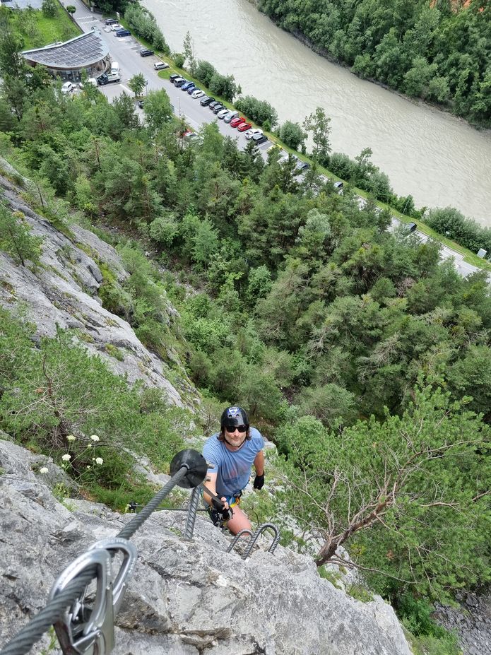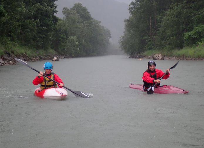 V noci nás budí déšť, stavíme stan a vyspáváme do dlouhého rána. Na Noce to je ještě 3,5h, hledáme, kde natankovat plyn, ztrácíme další hodinu. Plán Itálie padá a míříme na Sannu, 45min vzdálenou. Stav dobrý. Nasedáme na soutoku Trisanny a Rossany. Markéta převáží auto a má v plánu ferratu v Landecku. První vyráží Jarda na kajaku, pak Mako s Křap na Barikádě a Tíva na kajaku na závěr. Síla vody je po dlouhé době na pocit pořádná. Kličkujeme mezi kameny, zavěšujeme. Tíva tam u nějakého kamene padá, ale na podruhé pěkně zvedá. Blížíme se k silničáku a peřeji zvané Schiefes Eck. Jarda staví vpravo, Tíva vlevo opět eskymuje a zajíždí za ním. My stavíme výš a sjíždíme k nim. Tíva hlásí, že dál nejede, že se necítí. Křapík se také začíná cukat. Volám Markétě a jede zpět. Křap nakonec také vystupuje, má narozeniny, chce klid. Přejíždíme na druhou stranu pod silničák a měníme lodě. S Jardou prohlížíme peřej, nic extra tam není. Vlevo v kopcích je bouřka, sedáme do kajaků a frčíme dál. Ostatní jedou dolu na ferratu. Na řece jsou pěkné vlny, moc se nám to líbí. V Pians nás čeká katarakt. Stavíme v bazénu nad, původně jsme chtěli prohlížet, ale shora to do půlky vypadá čistě. Domlouváme se na vracáku a frčím dolů. Vlny, po stranách balvany, jen ten vracák je úplné tekoucí bahno a moc to tam nedrží. Koukám dál a proudnice je cajk, mávám na Jardu, ať pokračuje dál a startuju za ním. On jede sjezd, já si párkrát zastavím. Hustota vody je neuvěřitelná, až křupe mezi zuby. Sanna frčí dál, sklouzáváme jeden kamenný dvoumetrový práh, pak nás čeká hravá čtyřková peřejka. Na slalom krásný terén. Těsně před soutokem je 5m jez, který je lepší prohlédnout, jak pamatuji, stavění nic moc. Jarda přetahuje, já jedu z leva na střed jazykem, přes bublák a dole netrefit skalky uprostřed proudu. Vplouváme do Innu, u nádraží vyhlížíme auto, ale Markéta píše, že stojí u obchoďáku naproti ferratě. Máme to 2,5km, za druhým mostem zastavit. Inn pěkně valí, po stranách jsou hrázky, na kterých se tvoří ohromné vlny a i válce. Surfujeme a sem tam sem rád, že mě ta vlna nechytla. Za zatáčkou rozpoznáváme naše kamarády na skále. Tíva s Křap zvolili kratší variantu, Markéta se šplhá více vlevo pěknou stěnou. U mostu vytahujeme lodě na parkoviště k nákupáku, zabíráme stání vedle auta, sušíme, balíme. Akorát doráží lezecký tým. Shodujeme se, že jedeme proti proudu Innu hledat spaní. Dole v údolí dvě místa neklapla, jedeme vzhůru údolím říčky Fagge a před Kaunertalem nacházíme plácek za tunelem. Večerní procházka podél křížové cesty ke kostelíku Kaltenbrunn nás odměňuje výhledy a malinami. Hodnotíme vydařený den, vaříme a slavíme.