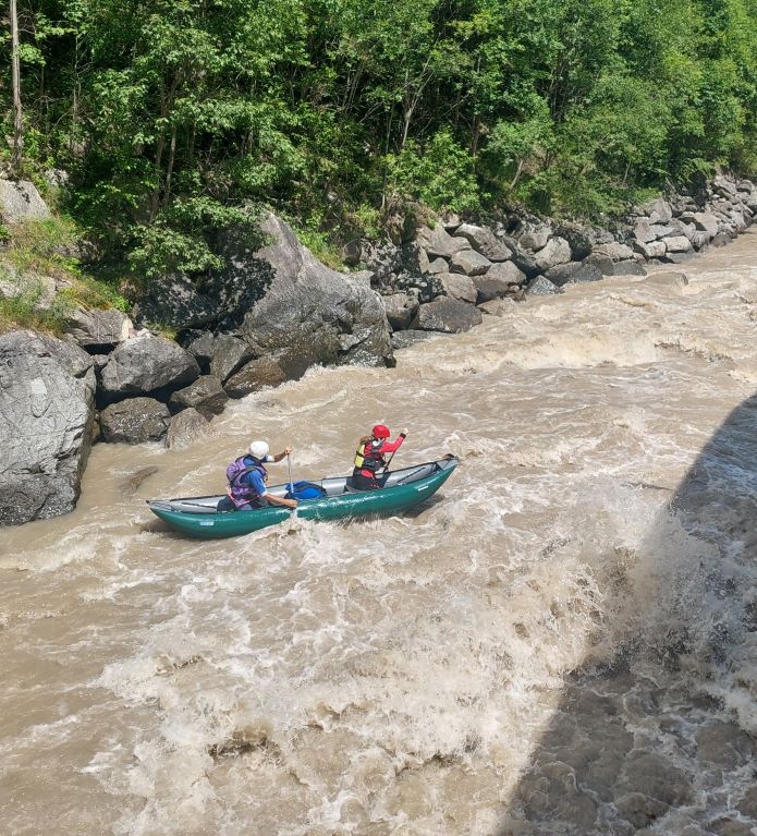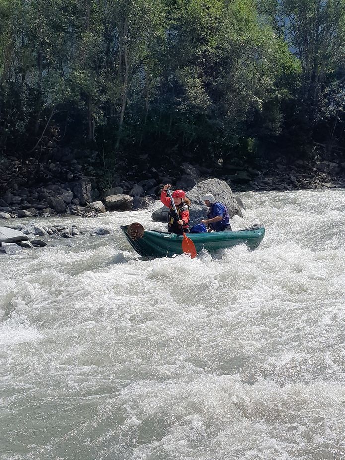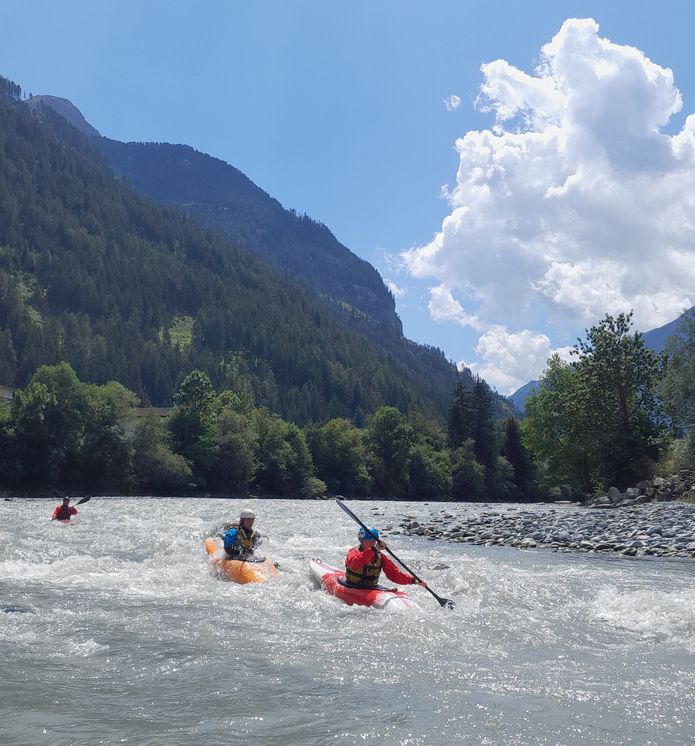 Ráno nás budí deštěm, my s Křap jsme ve stanu, zbytek v 7h usedá do auta a dospává tam. Po dešti snídaně a vybíráme dnešní cíl, Inn s Tossener schlucht. Sjíždíme dolů do údolí a míříme k hranicím se Švýcarskem. Vysedačku máme vybranou, plácek u ústí Fagge. Nasedačku si matně pamatuji a vybíráme louku před Pfunds. Na vodu jdeme všichni, Jarda sváží auto a vrací se na kole. My zatím sušíme hydro, nafukujeme Barikádu, modelujeme z písku a svačíme. Jardu zdrží přerovnávání auta, aby vyndal kolo, a zapamatování trasy. Startujeme 3 kajaky Markéta, Tíva a Jarda a my na Barikádě. Slunce pere, začínáme dvojkou-trojkou, žádný stres a pohoda. Sem tam peřejky, kochačka, trenink. Jsme domluveni, že těžší místa sklouznu na kajaku místo Markéty. První místo je u ústí Schontobelmure, do koryta jsou naplavené balvany a cesta není jednoduchá. Prohlížíme, jedu první, na hraně trochu poserfuju, abych ostatní uklidnil, pak se prosmýknout průjezdem v hrázce, najet na střed a mezi balvany skrz vysoké vlny dolů. Za mnou suverénně Jarda. Vracím se a nasedáme do Barikády, Tívovi najíždíme stopu a s přehledem jsme dole. Na levém břehu jsou jakési tekuté písky či bahna, stačí chvilku postát a člověk se propadá a propadá. Chvilku klid, za chvíli řeka nabírá na spádu, přibývá kamenů, Markéta statečně šulí při břehu a staví. My stavíme níže, ukazuju jí kudy a odchytávám. Kluci projedou. Pak to proletíme skrz pár vln, nic hrozného. Dole stavíme a běžím pro kajak. Dál to je pěkně balvanité, chce to držet pěknou lajnu a nevymýšlet kličkovačky. Objevuje se zatáčka, začíná to padat dolů. Markét včas vylézá. My zavěšujeme uprostřed řeky nad vstupenkou za skálou, vstávám a ukazuju Jardovi. Cesta jasná, průjezd hrázkou, v malé tišince zatočit vpravo, objet skalku s vývarem a za ní pěkně na střed a dolů. Kohout, dole vlnoválec a proud ženoucí na skálu, takže rychle vpravo a hotovo. Jsme dole bez ztráty kytičky. Běžím nahoru pro kajak a cestu si zpestřuji pár závěsy. Dole s Jardou prozkoumáváme vlnoválec, surf super, přejezdy též. Za mostem je takový kataraktík, Křap s Markét se rozhodují ho jet na Barikádě spolu. Já to najíždím a čekám dole. Děvčata diskutují, plánují, nasedají a jedou. Vypadá, že se zcela nedohodly kudy, na palubě malá přetahovaná, ale nakonec projíždějí s veselou. Střídáme se v lodích. Řeka se postupně vyklidňuje. V jediném mobilu došla baterka, vysedačku prostě musíme poznat. Uklidňuje mě, že pod tím je přehrada. Jarda jednou vylézá a naštěstí je v obraze, ještě pár km. Zprava vrací vodu do řeky, které je tak 5x více než doposud a s teplotou tak o 10 stupňů nižší. Vracáky teď mají na síle, ještě jeden stupeň s průjezdem uprostřed, nádherné megavlny a dojíždíme do cíle. Někteří jsou trochu vymrzlí a oceňují rozpálený vůz. Vytahujeme vaření a vysíláme Jardu nahoru pro kolo. Uvaříme, zabalíme a jedeme si to zbaštit na naše vyzkoušené místo za tunel. Únava nás dohání a brzy odpadáme. Na ráno plán, brzy vstát a vzhůru údolím do hor.
