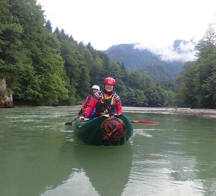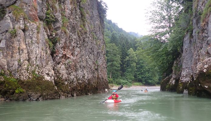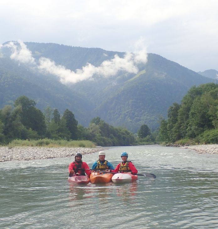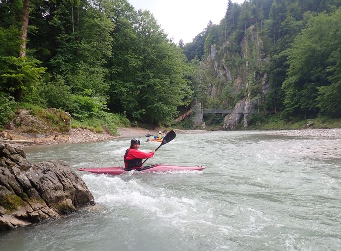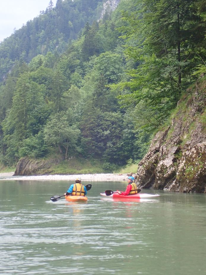 V neděli se sice jede domů, ale to neznamená, že se nesportuje! Vybíráme něco přívětivého, bonbónek na závěr. Tiroler Ache. Sice jsme jí už všichni jeli, někdo i víckrát, ale je to tak krásný kaňon, že se to může klidně opakovat. U mostu asi 7 km nad Kossen vykládáme lodě a sluníme se, zatímco Jarda sváží auto dolů. Než se vrátil na kole zpět, dává se do deště a přichází bouřka. Nenecháváme se odradit a dobře děláme. Svačíme sice ještě pod mostem, ale pršet brzy přestává a tak si užíváme kamenné kulisy vzpříčených vrstev dokonce chvilkami i za slunce. Vody je spíše méně, takže musíme hlídat mělčiny, o to lépe je možné prohlížet vodou ohlodané skalní stěny. Potkáváme i obrovský kolotoč, do kterého Kořínci samozřejmě naskakují a plují s Barakudou tu po proudu ke skále, tu od skály z kopce proti proudu ke břehu a zpět do hlavního proudu a ještě párkrát dokola. Já jsem k těmto skotačivým místům řeky opatrnější, musí se bedlivě sledovat, odkud co teče a kam se má člověk naklánět. Ještě pár meandrů a najednou se údolí rozšíří a už je tu most a vysedačka u Ettenhausen. Jarda odjíždí zase pro kolo, my ostatní vaříme, balíme a po 18. hodině odjíždíme. V Praze vypouštíme Maka, metro už nejezdí, tak bude mít ještě cestu do bytu skoro jako my do Jablonce.