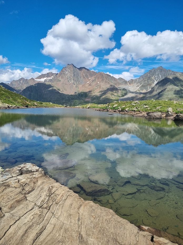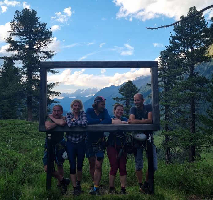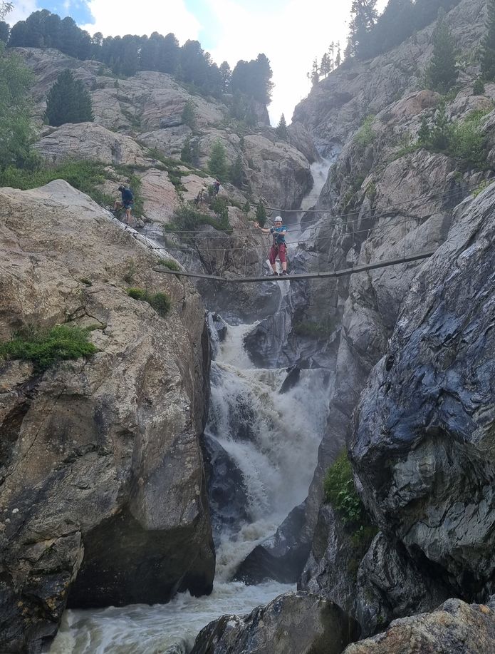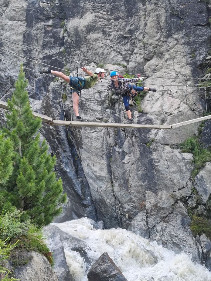 Náročný program a pozdní večeře se ráno projevily potřebou delšího spánku, a tak když se u snídaně konečně scházíme, dochází nám, že není třeba řešit dilema, jakou plánovanou trasu ke hřebenům zdejších hor zvolíme. V každém případě bychom se vraceli totiž za tmy. Ale vrcholů se jen tak přece nevzdáme! Co takhle zkusit tedy tu silničku, u které spíme a která aspoň na mapě se zdá vede až skoro k ledovci? Platíme tedy mýtné a už si to supíme i s kajáčky na střeše vzhůru serpentinami do údolí Kaunertall. Kolem polovypuštěné přehrady, hlubokého kaňonu, barevných luk až do království ledu a kamení. Parkujeme opravdu až ve výšce 2700 m n. m. a jdeme se konečně podívat aspoň na hranice s Itálií. Míjíme sněhová pole nakrytá textilií a ve výšce 3050 na hřebeni zjišťujeme, že v Itálii je jenom mlha, bůh ví, jestli vůbec nějaká Itoška ještě je. Po kamenité vycházce prohlížíme zbytek ledovce, je to docela smutný pohled. A sjíždíme trošku níž, spravit si náladu mezi alpskou květenou všech různých barev. Vrcholem dne jsou dvě nenápadná plesa Seeles Seen, kde se koupeme a fotíme s překrásnými panoramaty hor. Jsou tu obrovští pulci a na dně číhají malí dráčci čolci. Scházíme podél krásných vodopádů prozářených sluncem, zatímco Jarda se vrací kousek pro auto. Než opustíme tohle krásné údolí, zastavujeme ještě u ferraty Holderli-Seppl-Klettersteig. Vede nad kaňonem s pěnivou vodou, jsou tu i krásné mostíky. Kluci pokukují po divočících tocích, ale naštěstí je už hodně hodin, tak se nemusíme bát, že by třeba před smrtelným kataraktem nad přehradou nestihli zastavit. Spaní už hledat nemusíme, tráva je ještě od našich těl po předešlé noci slehlá, tak zas pozdní večeře, vyprávění a zasloužený spánek.